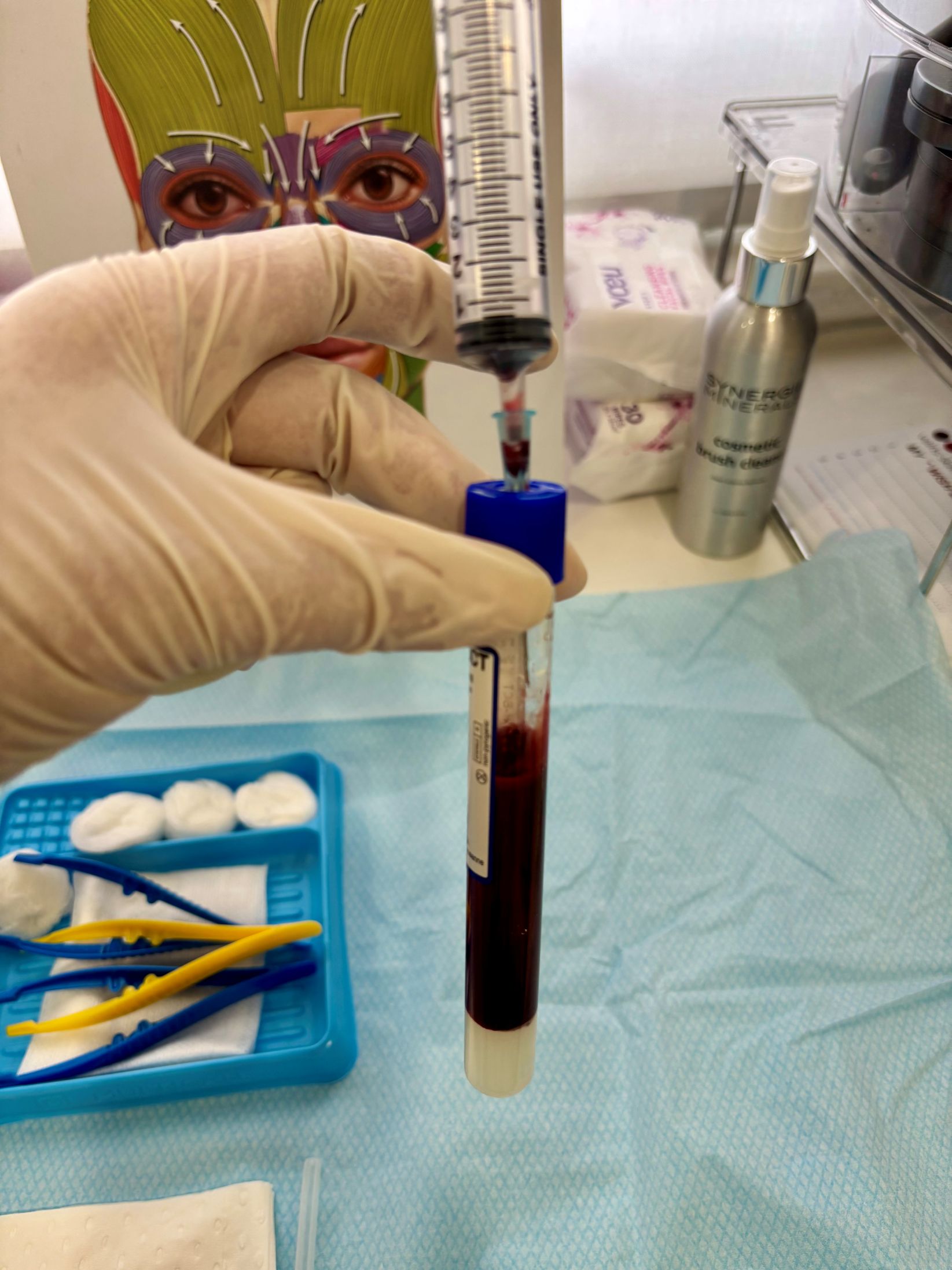 The doctor or nurse draws blood from your arm vein like a blood test. This is placed in a specialised test tube that is spun in a centrifuge to separate the PRP – platelet rich plasma. This golden coloured fluid is then injected back into your skin, scalp or joint where the platelets, cytokines and growth factors start to heal damage from aging, degeneration or stimulate hair growth in hair bearing areas.